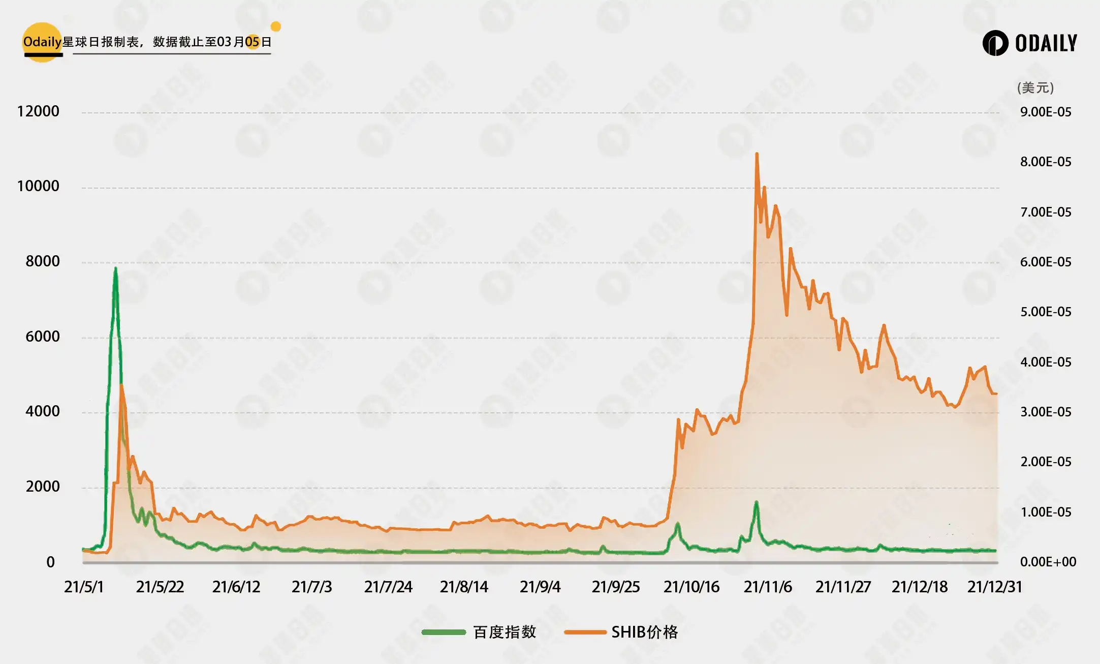 SHIB 的价格与社媒搜索数据如下,规律与 DOGE 类似,极端的热搜意味着行情的见顶。但可以看出在国内的关注度主要是 5 月的 DOGE 引发的「动物园行情」所带来的,第二轮国内关注度显著下降。