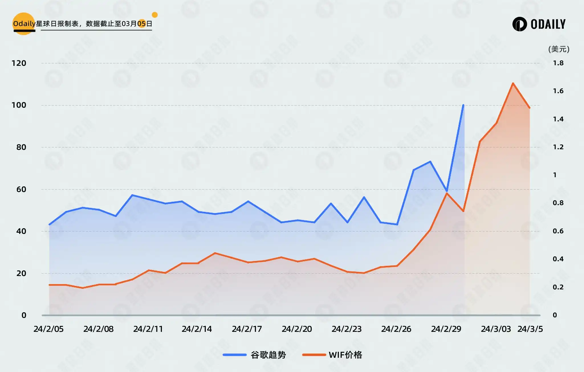 WIF 近一个月的价格与社媒搜索数据如下,国内对其没有明显的关注变化,值得注意的是,在 3 月 5 日 18 时,即币安公布上线 WIF 现货之后,热度开始飙升,出现了类似 PEPE 的偏离情况。