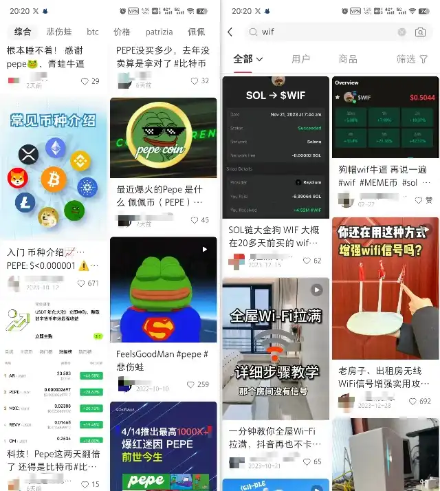 小红书:该平台上的情况与微博类似,PEPE 关联度极高,但多数发帖时间并非近期,点赞量不高,说明仍未引发圈外用户 FOMO 和广泛关注。而 WIF 也一样有零散相关内容,时间分布参差,多数与「WiFi」词条相关。