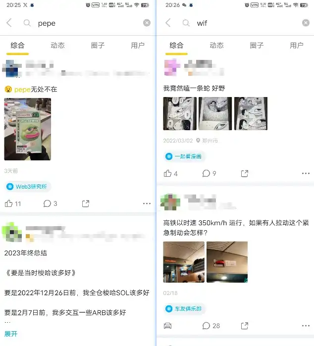 即刻:该平台的 Web3 浓度实际上不逊色于微博与小红书,但更主要为正规项目宣发和从业人员交流。目前 PEPE 仅有少数帖子讨论其涨幅,而 WIF 则无人提起。