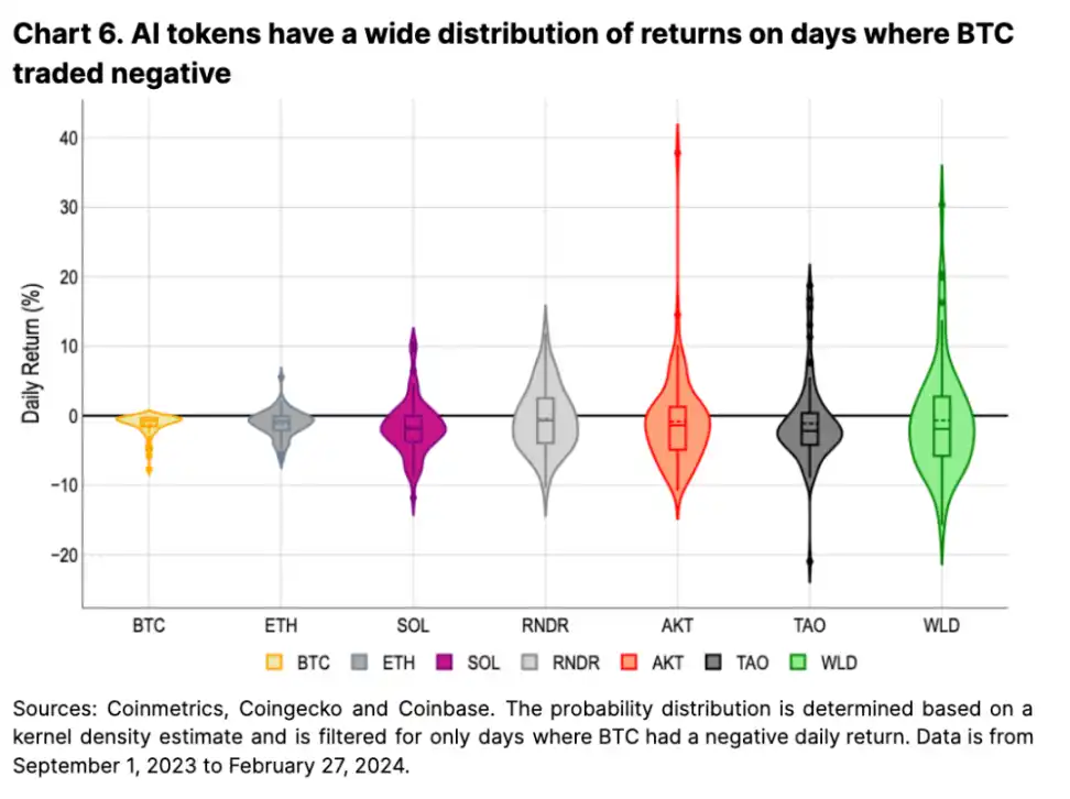 尽管有上述问题,但从 23 年第 4 季度开始,许多 AI 代币的表现都优于比特币和以太币,以及 Nvidia 和 Microsoft 等主要 AI 股票。我们认为这是因为 AI 代币通常受益于更广泛的 Crypto 市场以及相关人工智能热潮的相关表现(见附录 2)。因此,即使比特币价格下跌,以人工智能为重点的代币也会经历价格上涨波动,从而在比特币下行期间产生上行的波动性。图 5 展示了比特币交易下跌的日子里 AI 代币的表现。