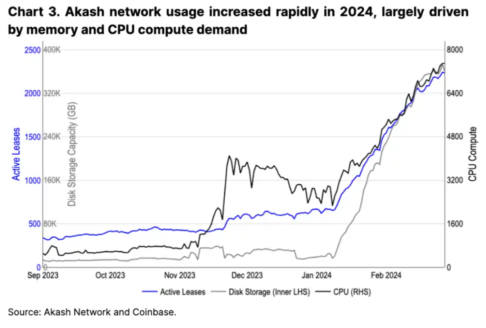 Crypto 中的去中心化计算(DeComp)领域也旨在成为中心化云计算的替代品,部分原因是现有的 GPU 供应紧缩。一种针对这种短缺的提出的解决方案,例如 Akash 和 Render 等协议所采用的是将闲置的计算资源重新整合进一个中心化网络中,从而降低中心化云提供商的成本。据初步指标显示,此类项目似乎在用户和供应商的采用率上均获得了增长。例如,Akash 从今年年初至今的活跃租赁(即用户数量)增加了三倍(见图 3),这主要是由于其存储和计算资源的使用量增加。
