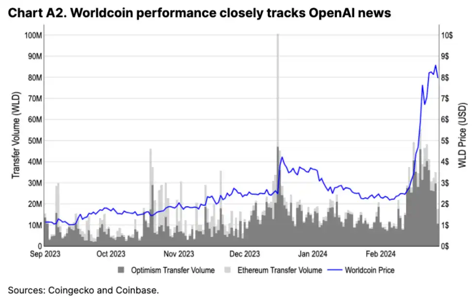 也许 AI 代币跟随人工智能市场热潮的最明显例子便是 Worldcoin。它于 2023 年 12 月 13 日发布了 World ID 2.0 升级版,但几乎没有引起人们的注意,但在 Sam Altman 于 12 月 15 日推广 Worldcoin 后,它上涨了 50%。(关于 Worldcoin 未来的猜测仍然很妖魔化,部分原因是 Sam Altman 是 Worldcoin 背后的开发商 Tools for Humanity 的联合创始人。同样,OpenAI 于 2024 年 2 月 15 日发布的 Sora 导致其价格上涨了近三倍,尽管 Worldcoin 的 Twitter 或博客上没有相关公告(见图 6)。截至发稿时,Worldcoin 的估值为 800 亿美元,这与 OpenAI 在 2 月 16 日的 860 亿美元估值很接近(这是一家年化收入达到 20 亿美元的公司)。