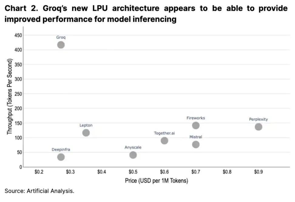 我们看到的第二个主要趋势是围绕硬件架构的竞争格局。英伟达 (Nvidia) 的 H200 处理器将于 2024 年第二季度上市,下一代 B100 的性能预计将进一步翻倍。此外,Google 对其自有的张量处理单元 (TPUs) 的持续支持以及 Groq 的新语言处理单元 (LPUs) 可能在未来几年中也会增强他们在此领域的市场份额(参见图 2)。这些发展可能会改变人工智能行业的成本动态,并可能使那些能够快速调整、大规模采购硬件并设置任何相关物理网络和开发工具的云服务提供商受益。