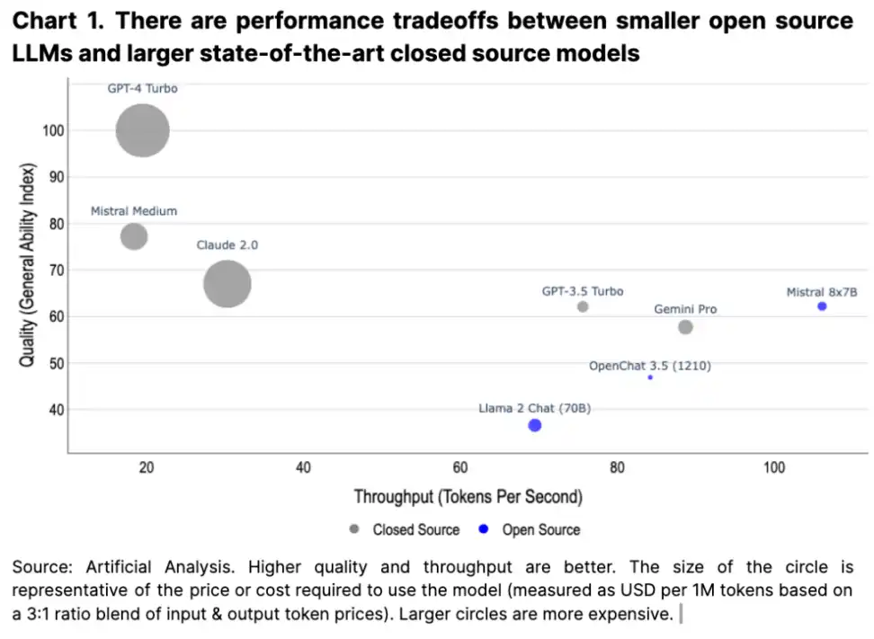 第二个趋势是小型模型的质量和成本效益不断提高(早在 2020 年的 LLM 研究中就曾强调这一点,最近在 MIcrosoft 的一篇论文中也强调了这一点),这也与开源文化相吻合,以进一步实现高性能、本地运行的 AI 模型的未来。在某些基准测试下,一些经过微调的开源模型甚至可以胜过领先的闭源模型。在这样的世界里,一些人工智能模型可以在本地运行,从而最大限度地去中心化。当然,现有的技术公司将继续在云上训练和运行更大的模型,但在两者之间的设计空间中会有权衡。