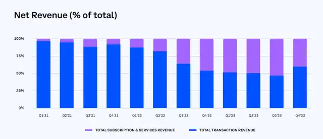 2023 财年,48% 的净收入来自非交易相关服务,而 2022 财年这一比例仅为 25%。这种多元化有助于减少 Coinbase 未来收入的波动性,也会带来更稳定的盈利状况。