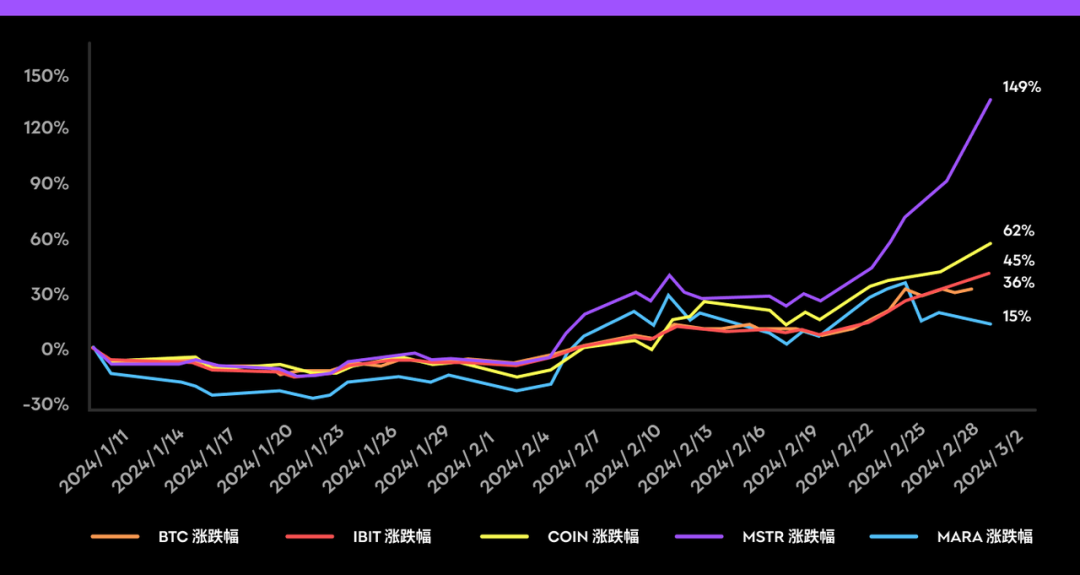 下图展示了 1 月 11 日比特币 ETF 获批以来,比特币、比特币 ETF(以贝莱德 IBIT 为代表)、Coinbase、MSTR、Mara 五个标的涨跌幅情况(截至 3 月 4 日收盘):