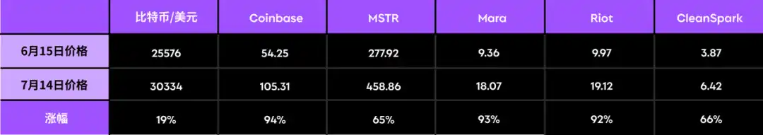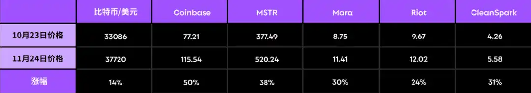 这期间,Coinbase、MSTR、Mara、Riot 和 CleanSpark 股价增长了 94%、65%、93%、92% 和 66%: