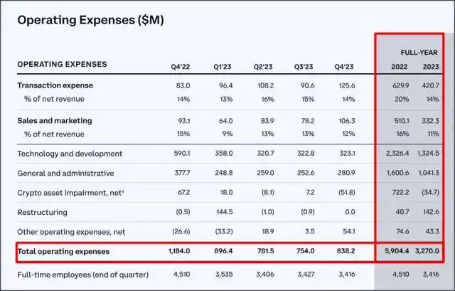 另一方面,Coinbase 大幅削减运营支出现已初见成效。在上一次加密熊市期间,Coinbase 解雇了大量员工并大幅削减成本。今天的 Coinbase 是一家精简得多的公司,其 2023 财年运营费用已经同比下降 45%。