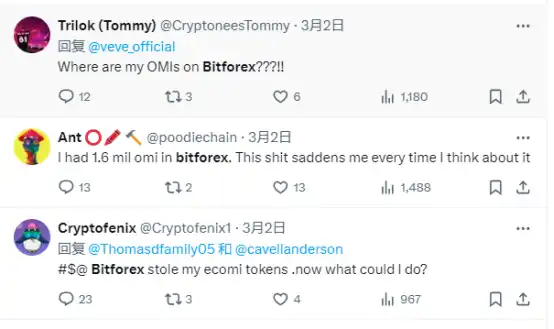 X 平台上多个海外 OMI 持有者询问 BitForex,来源:X 平台