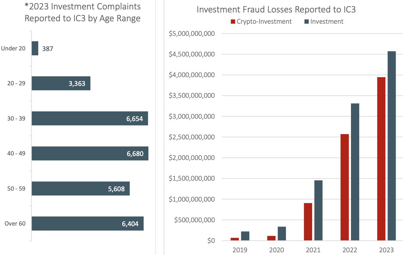 同时,2023 年所有投资损失的总金额为 45.7 亿美元。这意味着与加密货币相关的 39.4 亿美元的欺诈损失约占全国所有投资欺诈损失的 86%。