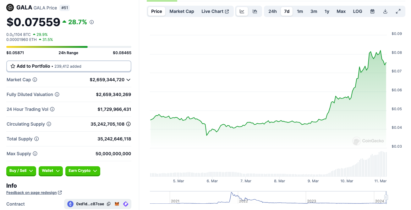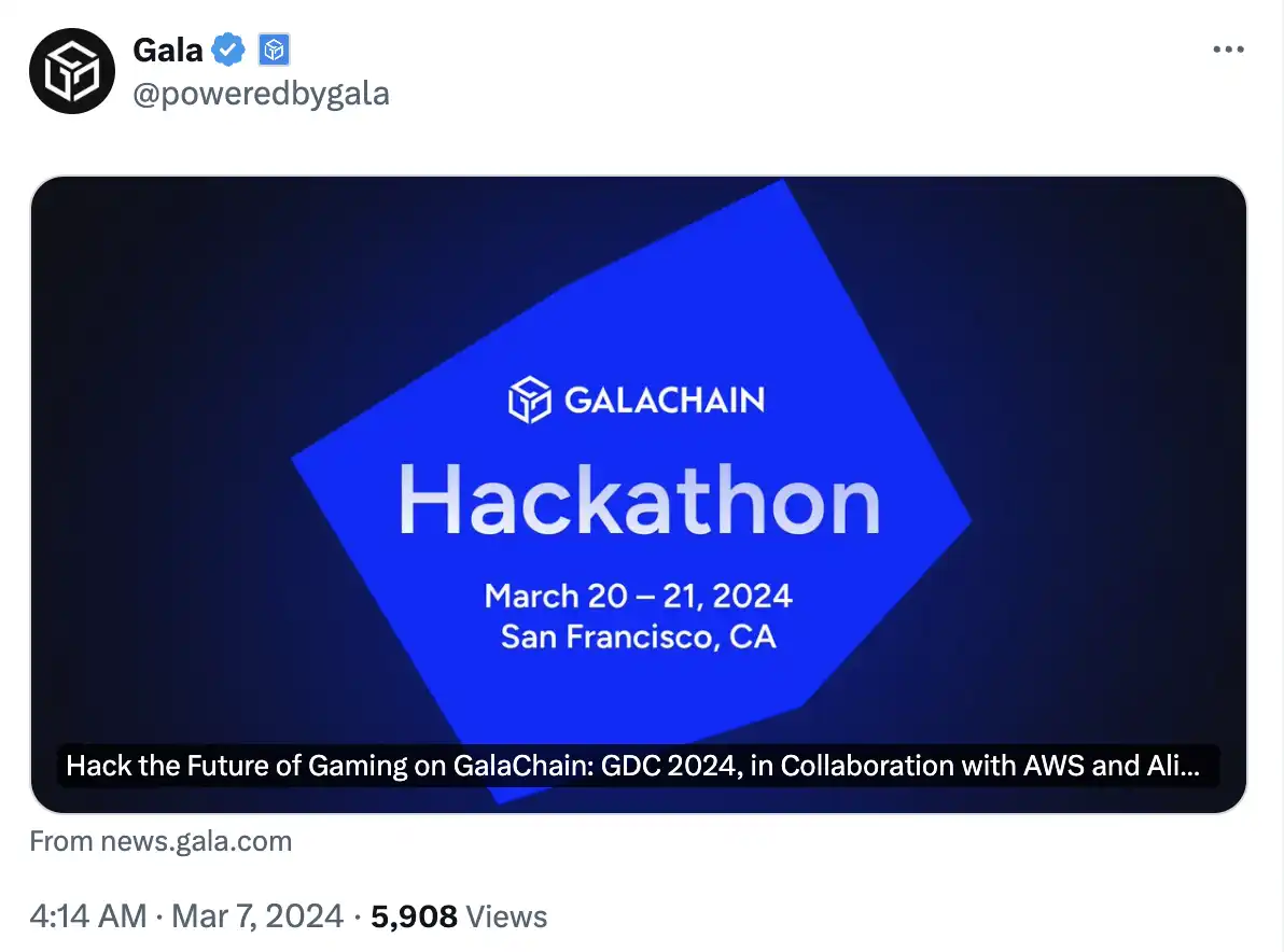 GALA 和游戏板块代币的上涨和此前 AI 代币上涨有一定相似性,即「大会预期」。 此前报道,加密游戏公司 Gala Games 宣布与 PC 制造商 Alienware 和亚马逊网络服务 (AWS) 合作,在 3 月 18 日的 2024 年游戏开发者大会 (GDC) 上举办黑客马拉松。