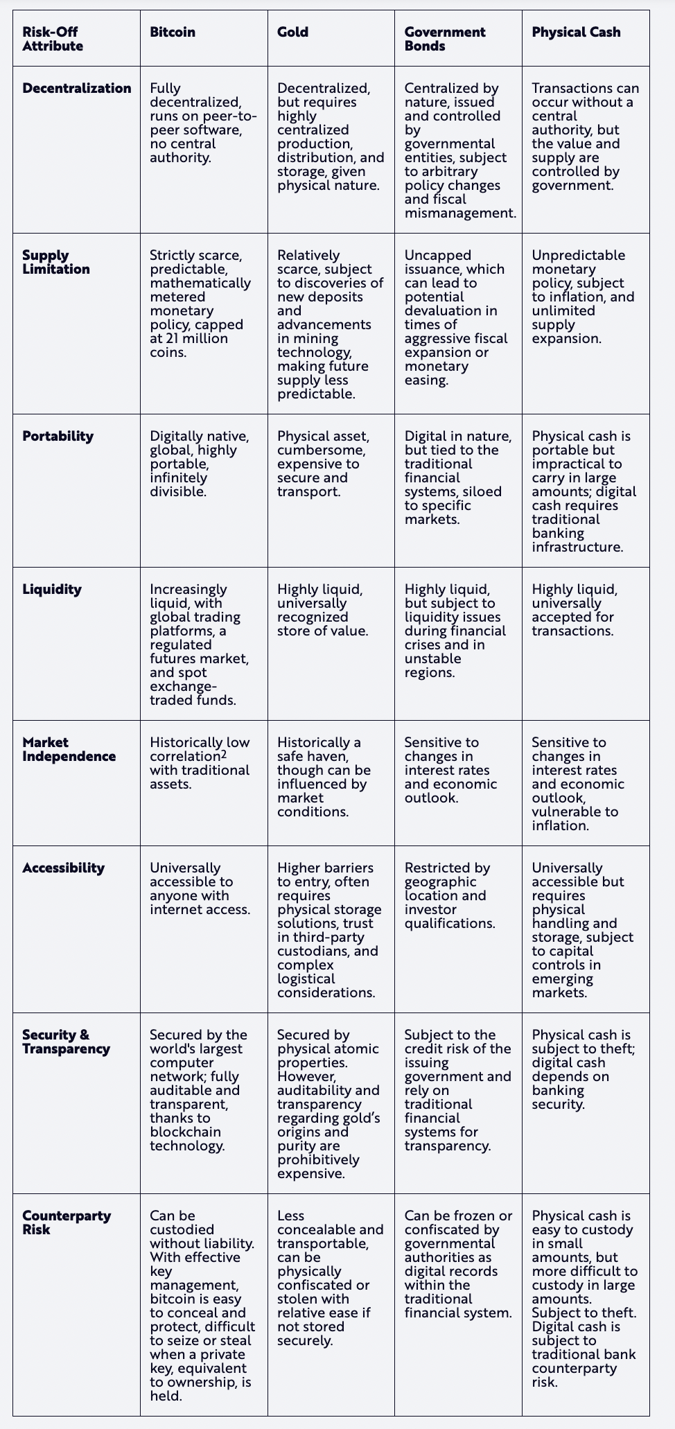 鉴于其技术基础,比特币相对于传统避险资产具有独特的地位,如下所示。