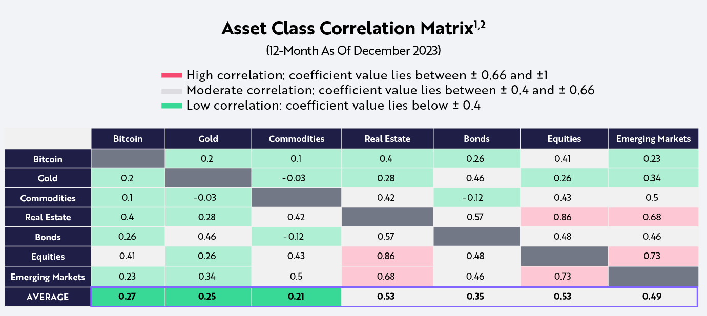 比特币适合作为避险资产的另一个原因是其收益与其他资产类别收益的相关性较低。比特币是少数几种相关性始终较低的资产之一,如下所示。2018 年至 2023 年间,比特币收益相与传统资产类别的相关性平均仅为 0.27。重要的是,债券和黄金(传统上被认为是避险资产类别)之间的相关性相对较高,为 0.46,而比特币收益与黄金和债券收益的相关性分别为 0.2 和 0.26。