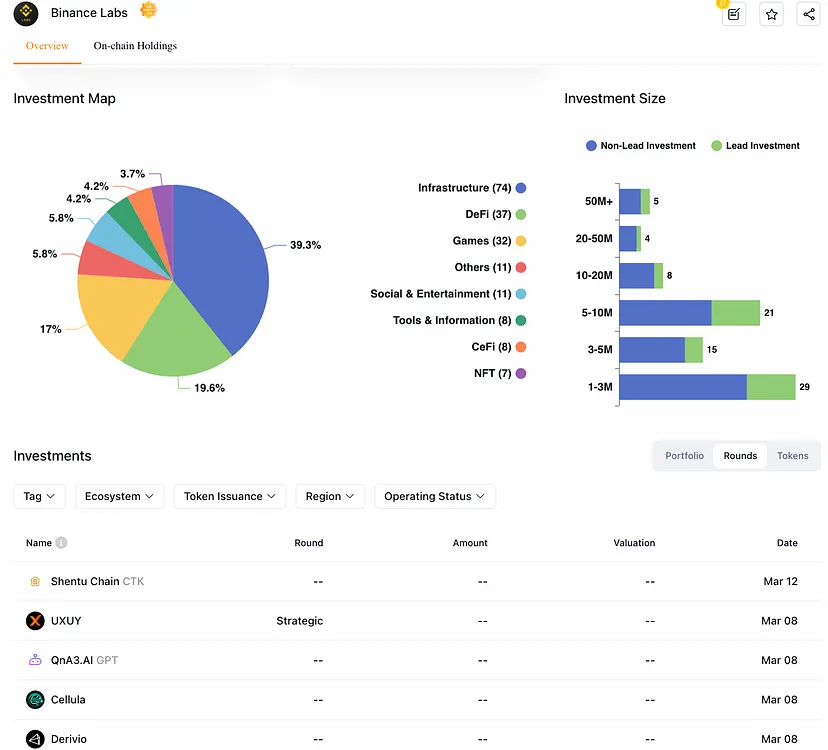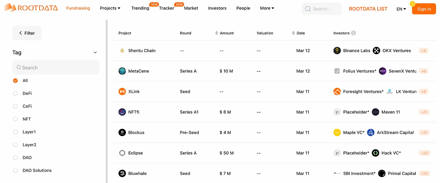 Rootdata 收集了所有市场融资活动的信息,并保证信息的即时更新。用户还可以根据不同板块,选择观察特定板块的融资表现。