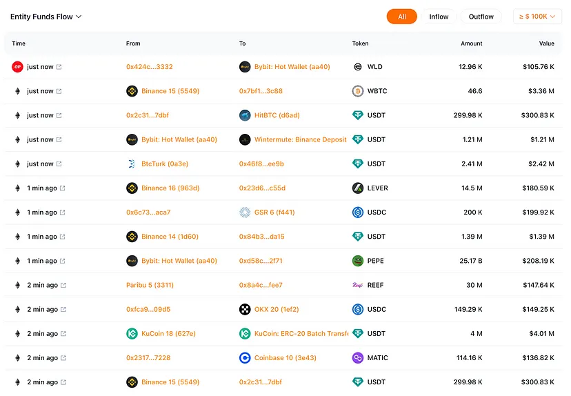 Rootdata 还记录了各个单位(包括:风投、交易所、做市商等)的钱包交易记录,用户可以通过这些信息了解机构的资金流向。