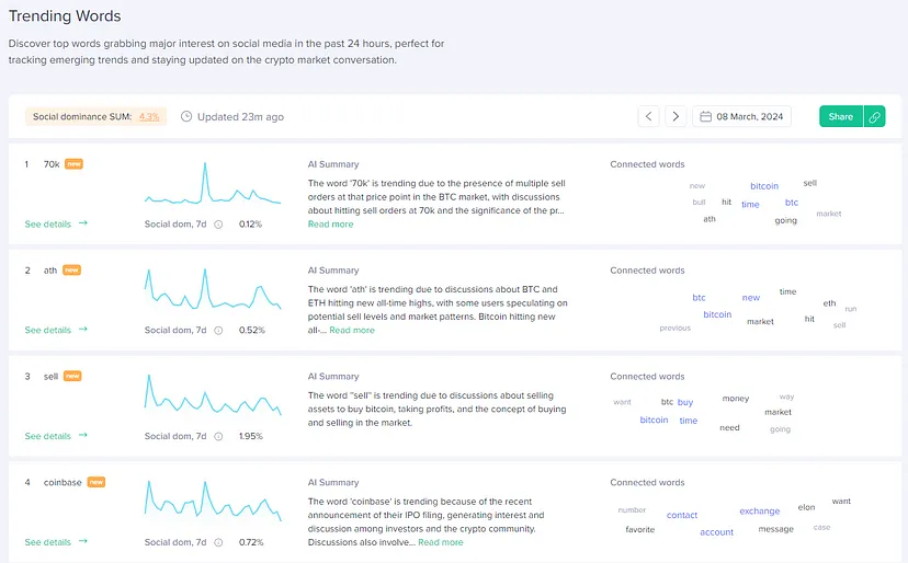 Santiment 能够通过 AI 技术整合网络上最多人搜索的关键词,准确反映大众关注的热点。