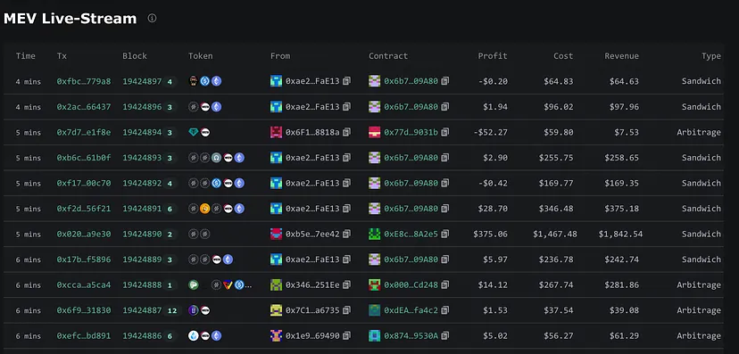 平台能够提供各类 MEV 活动的实际交易量和实际利润(扣除矿工费后的毛利)信息,包括它们的占比和增长情况。这样用户便可以获得一个非常清晰且全面的当前 MEV 市场的概览。用户可以清楚地实时地看到交易所涉及的 MEV 类型,发起 MEV 交易的合约地址,实际收益和开销等数据。