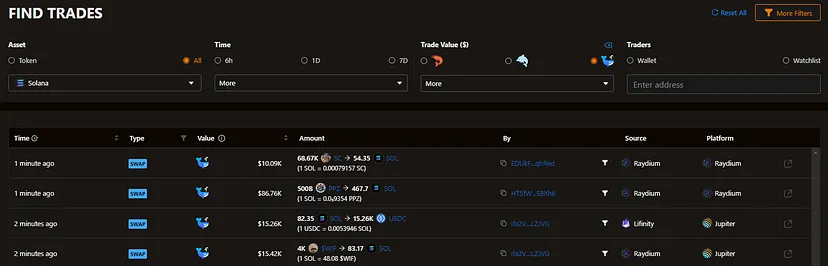 Find Trades:该界面还记录了链上的所有交易记录。其中最实用的功能是可以选择由「蝦」、「海豚」和「鲸鱼」代表的交易金额。追踪「鲸鱼」钱包的资金流向是追踪市场智慧的一种方法。