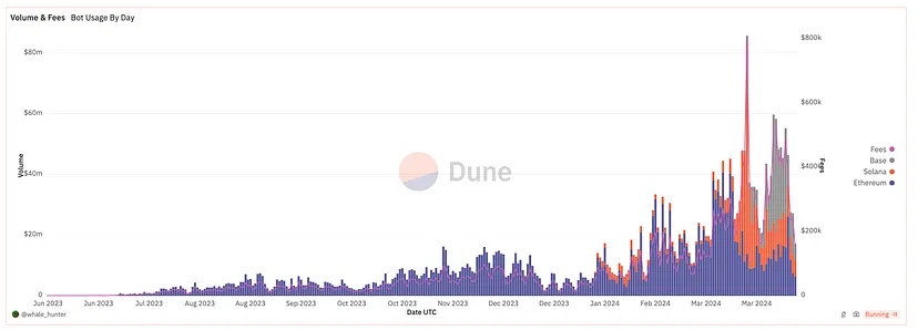 鉴于 Base 公链在坎昆升级后的交易费用显著降低,它已成为继 Solana 之后另一个土狗聚集的公链平台。 作为一个资深的 Sniper Bot,Unibot 在 Base 平台上的交易量也有所增加。