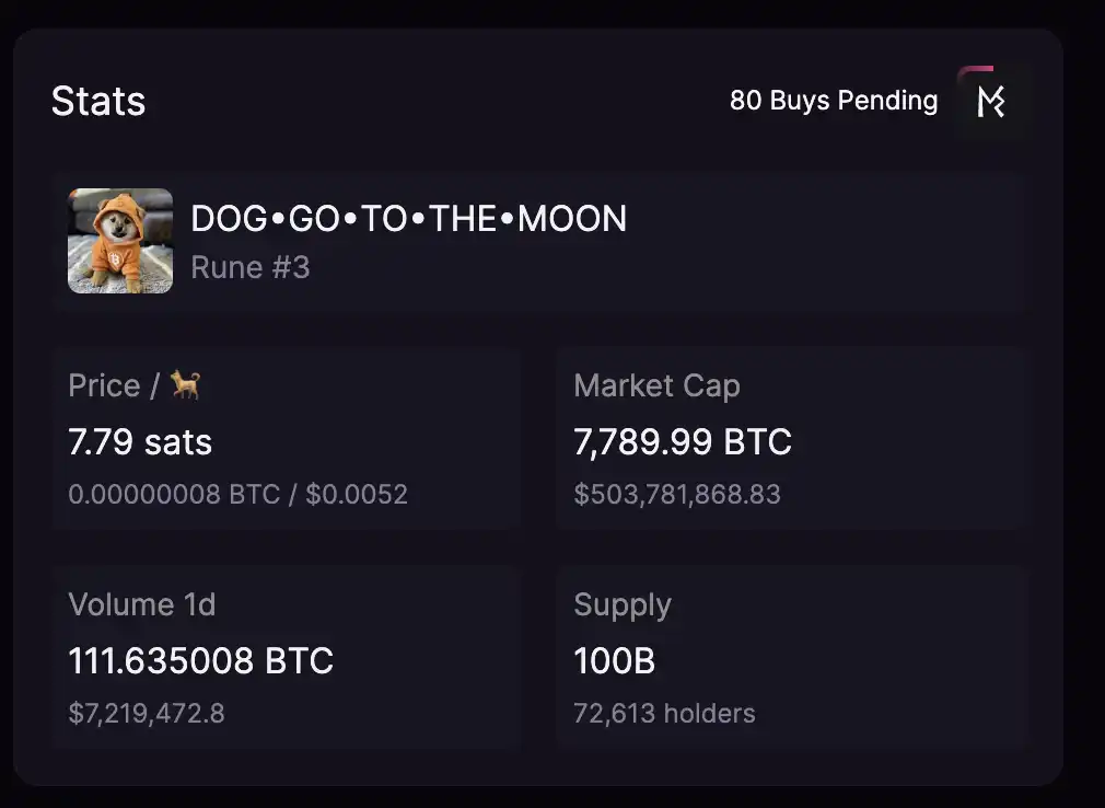 尽管 Runestone 的价格持续走低,但其空投的 Runes 模因币 DOG 自 4 月 24 日空投以来一直呈上升趋势。根据 Magic Eden 的数据,DOG•GO•TO•THE•MOON 的当前单价为 7.79 sats,24 小时交易量高达 111 BTC,断层碾压其他 Runes 资产,暂居 Runes 龙一。