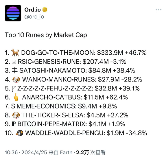 同时,DOG•GO•TO•THE•MOON 的总市值已达到 5 亿美元,当前 Runestone 加上 DOG 的市值已接近 Runestone 的历史高点。