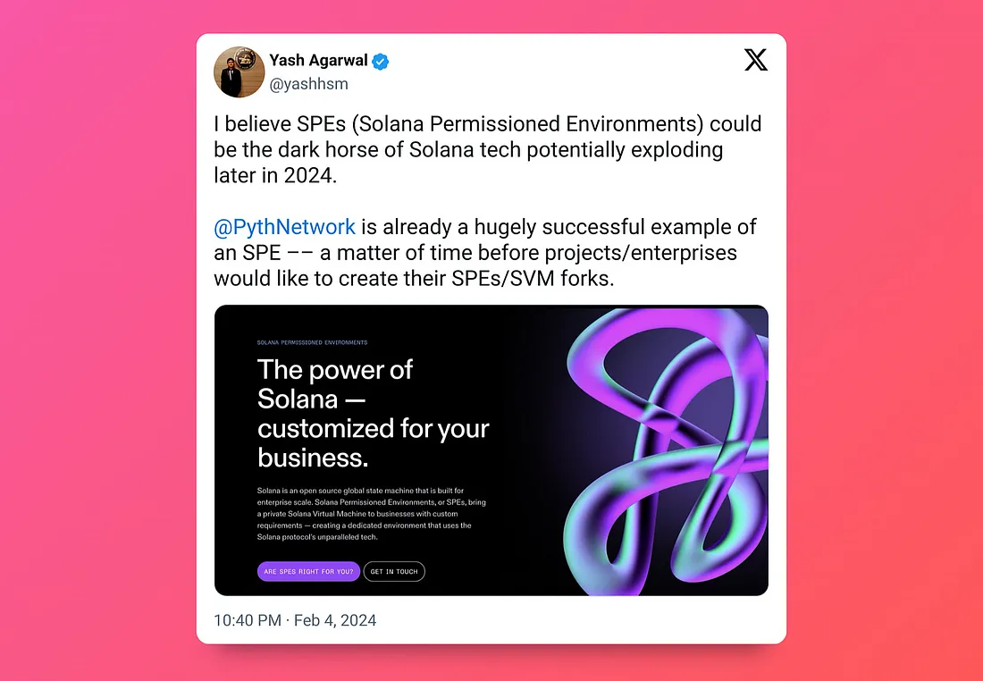 使Solana模块化的努力已经开始。正如Anza DevRel的帖子所示,Solana验证者和SVM(处理交易和智能合约/程序的执行环境)紧密耦合,并由Anza维护。然而,验证者客户端和SVM运行时将在接下来的几个月内分离。这种分离将为分叉SVM和轻松创建'Solana应用链'提供便利。