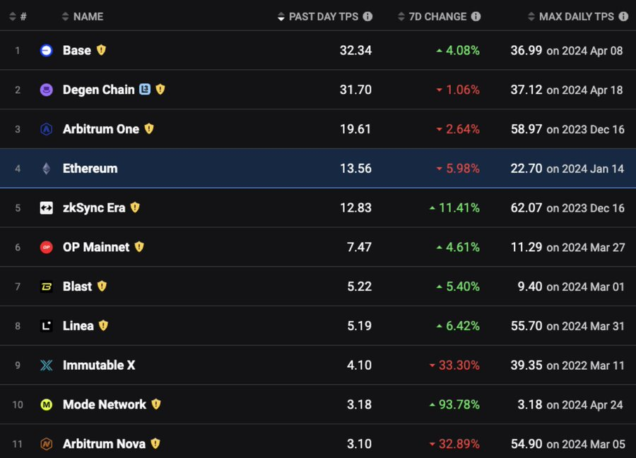 TPS 是我们非常关注的一个指标。我们希望我们的链能够支持更高的 TPS,因为它们可以支持更多的用户和应用程序。下面的图表显示了以太坊和 L2 的 TPS 数字。没有一条链曾经突破过 100 TPS 的标志。请注意,TPS 是一个通用的用于衡量规模的术语。TPS 是不准确的,因为并非所有交易都相同,它们在复杂性上有所不同。但出于简单起见,我们使用 TPS 作为衡量规模的指标。
