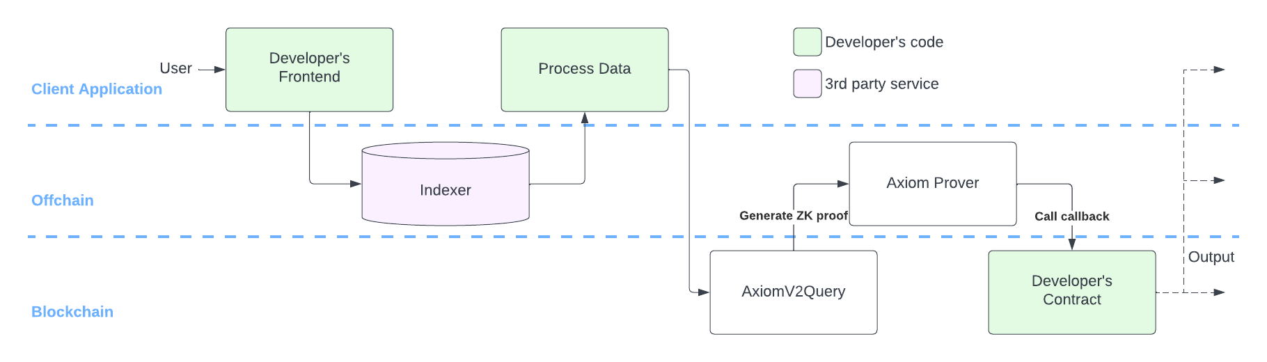 一个经典的ZK协处理器项目的技术架构基本如下,这是Axiom的简化技术架构,Axiom是该赛道的龙头之一。简单来讲,当用户对某个复杂计算有诉求时,你可以利用Axiom的链下服务计算结果并生成相关的ZK Proof证明,然后Axiom会将结果与证明作为参数调用Axiom的链上验证合约,该合约凭借着执行结果,执行证明,和由Axiom官方向链上提供的全链的区块关键信息,例如transaction merkle root等(维护全链关键信息的过程也是去信任的)这三部分数据,通过链上的验证算法验证结果的正确性。当通过验证后将通过回调函数将结果通知目标合约以触发后续的操作。