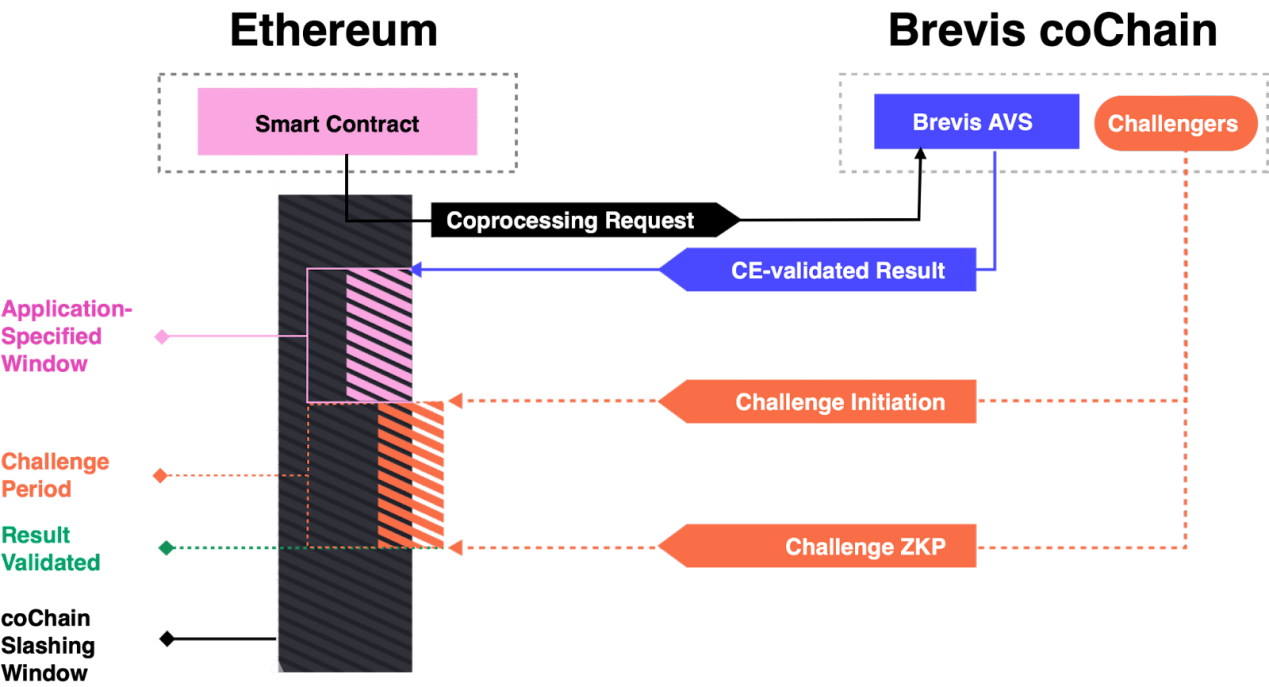 Brevis的核心团队来自于一个古老的明星项目Celer Network,均为一众华人技术大咖。在经历一番挣扎后于2023年初推出了Brevis,那是其定位还是ZK 全链数据计算和验证平台,当然这于ZK协处理器本质没有什么区别,只不过后者显得更酷一些。在过去很长一段时间里Brevis都是采用了上述的所谓“Pure-ZK”方案运营的。这就让其在使用场景的推广上显得力不从心,而在4月11日的博文中宣布与EigenLayer的合作,以及一个全新的“加密经济学+ZK证明”解决方案Brevis coChain。在这个方案中,验证层从Ethereum主网下沉到了一个由AVS维护的被称为coChain中。