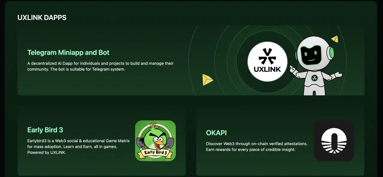 目前,UXLINK 生态主要的应用包括 UX Growth (Link to Earn) 和 Social DEX。