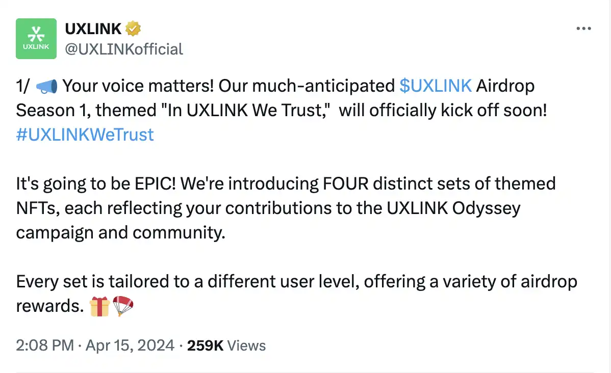 4 月 26 日,UXLINK 官宣了第一季空投活动,UXLINK 目前有接近 550 万用户,预计空投将覆盖 10% 的活跃用户。也就是将覆盖超过 55 万社区贡献者,为史上最大型的空投活动之一。