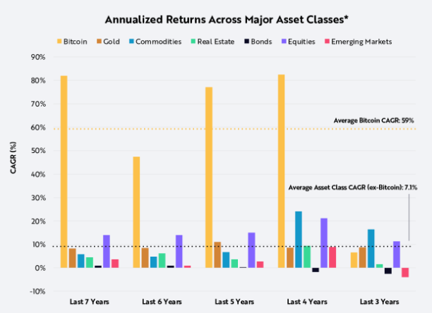 作为一种革命性技术和新兴资产,比特币的投机特性和短期波动性使其投资的决策变得复杂多变。目前比特币的市值已超过 1 万亿美元,在保持独立性的同时提高了其购买力。投资决策主要是在于择时和择价,从短期和长期来看,投资比特币的表现都优于其他所有主要资产类别。根据 ARK Investment Management LLC 基于 PortfolioVisualizer.com 的数据和计算,截至 2024 年 3 月 31 日,在过去 7 年中,投资比特币的年化回报率接近 60%,而其他主要资产的平均回报率仅为 7%。按照经典的现代 60/40 投资组合(即 60% 股票 +40% 债券),在过去 5 年中,持有比特币投资占比最大的投资组合表现最佳。