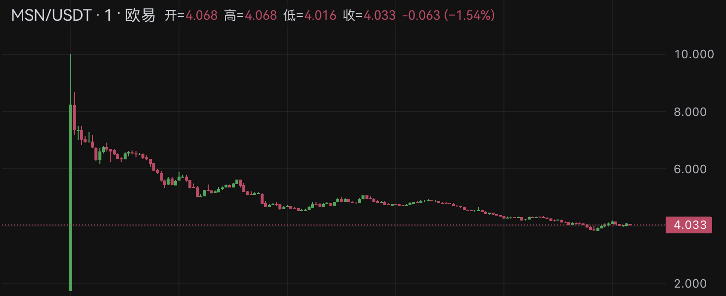 市场遇冷,新币表现也不尽人意。在 1 月以 10 美元估值获得融资的 Web3 带宽交易市场 Meson Network 代币 MSN 于今日上线 OKX,MSN 在开盘触及 10 美元后持续下跌,截至撰稿时报价 4.03 美元,两小时跌超 50%。