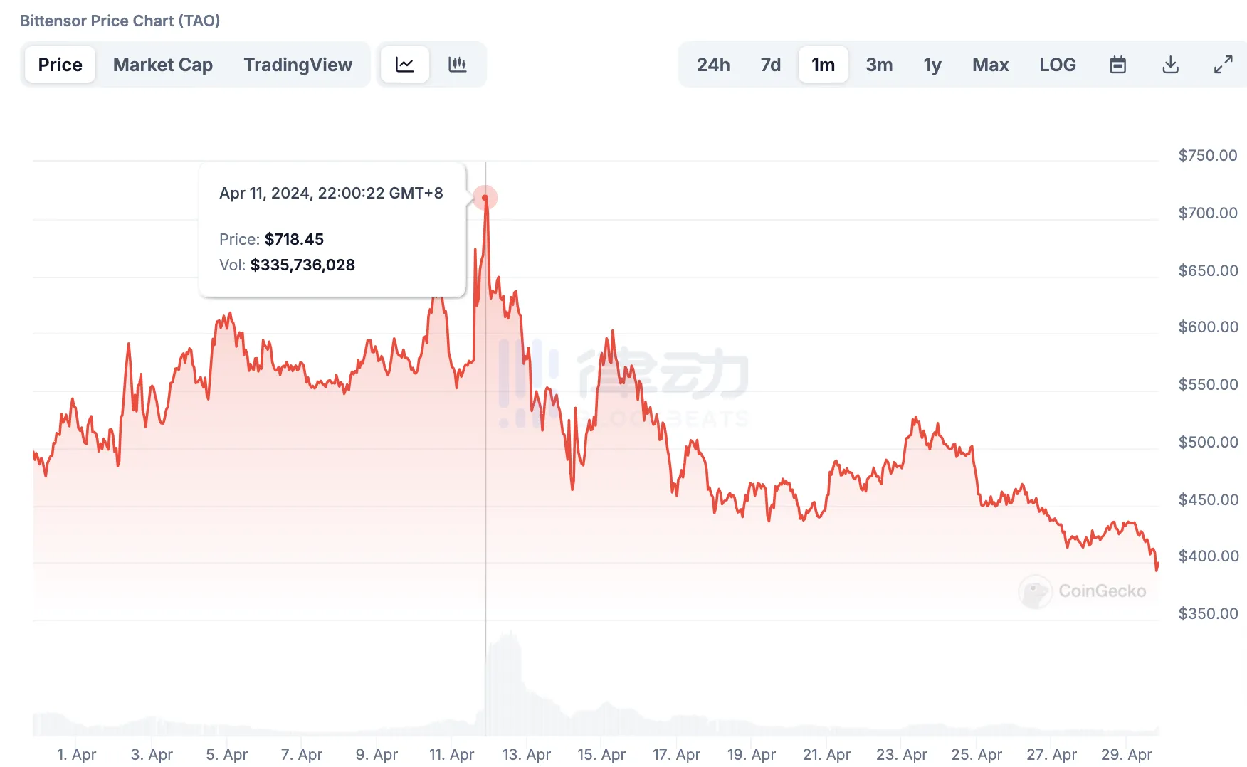 自从 4 月 11 日上线 Binance 后、触及 718 美元的高点后,Bittensor(TAO)就开启了「跌跌不休」模式,两周跌幅 27%,截至撰稿时为 399 美元,回到了三个月前的位置。