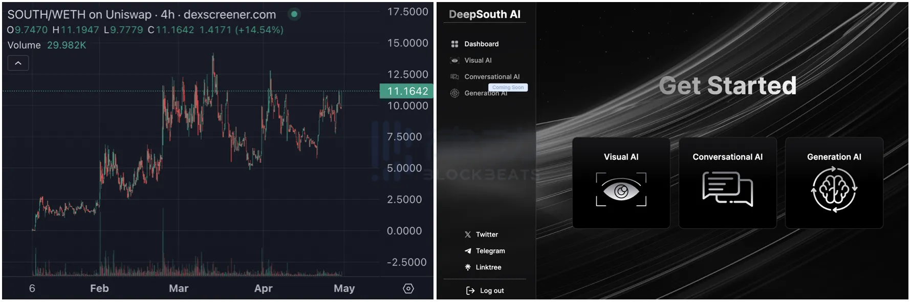 DeepSouth AI 是一个诞生于三个月前、「基于加密技术、利用神经拟态计算开发具有多种功能的人工智能应用程序」的 AI 项目。由于其在 4 月 22 日正式推出了可交互的平台,其代币 SOUTH 近一周涨幅超 70%。