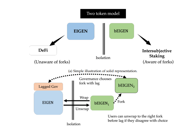 那么,如果服务提供商被认为提供了虚假服务或误导用户,平台的社区共识机制可能会触发挑战,形成一个分叉代币的事件,进而变成两个版本的EIGEN代币--- EIGEN 和bEIGEN。