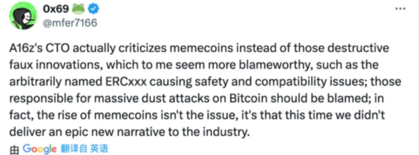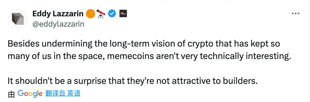a16z Crypto CTO Lazarrin 随后在 X 平台上吐槽,「Memecoin 破坏了让许多人留在加密领域的长远愿景,技术上也不吸引人;对于建设者来说不具吸引力。」