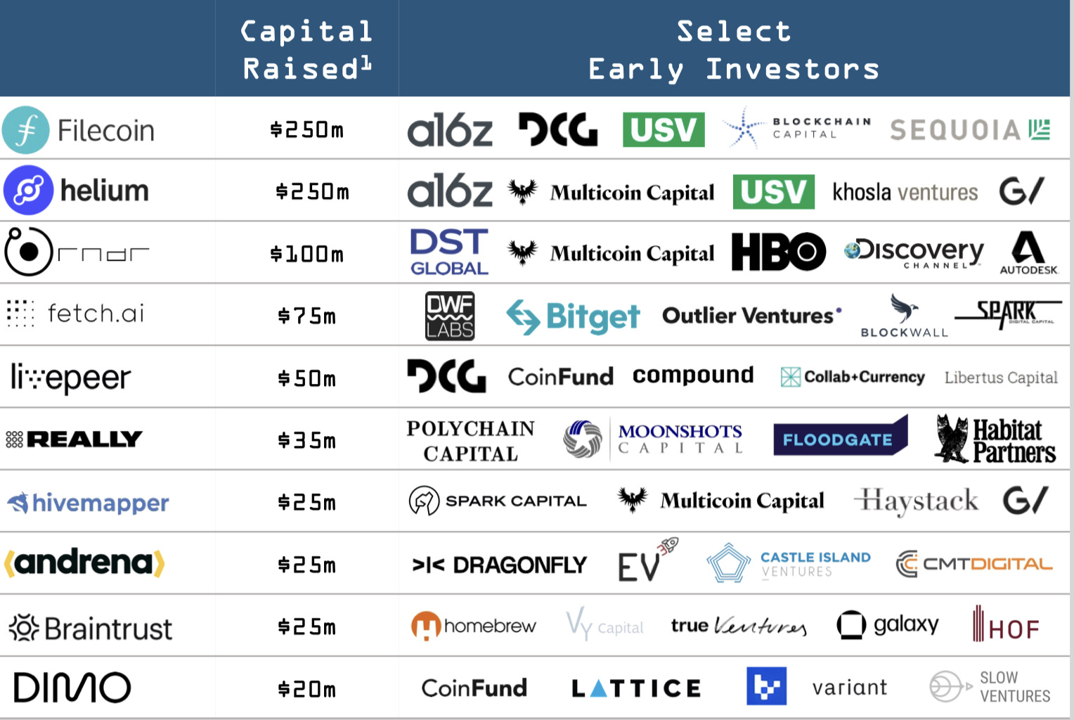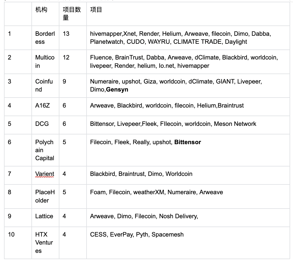 例如, Multicoin, Borderless, A16Z, HTX Ventures 等VC 都在 DePIN 有较多布局,并且投出的项目都是应用性非常强的,投机属性非常弱的项目,当然,相对于他们自己本身的Portfolio来看,DePIN的项目也只占比较小的部分。