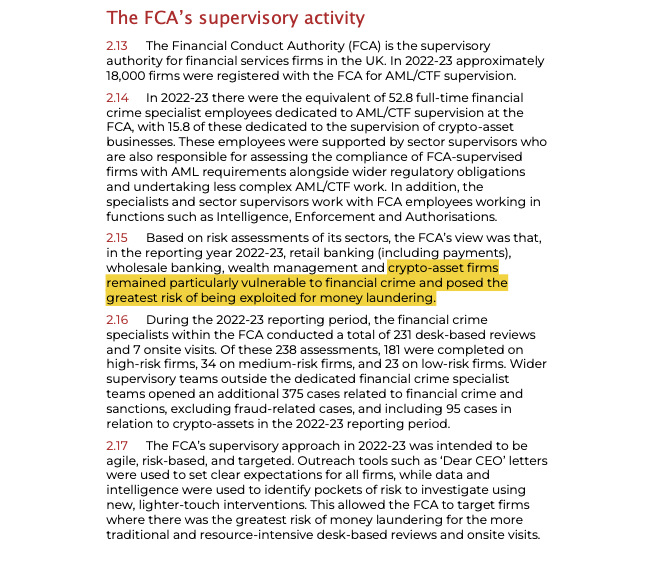 在5月1日的一份报告中,英国财政部从金融行为监管局(FCA)提供的数据中得出结论,加密资产公司是仍然 "特别容易 "受到金融犯罪侵害的前四类公司之一,尤其是在2022年至2023年期间的洗钱案件中。