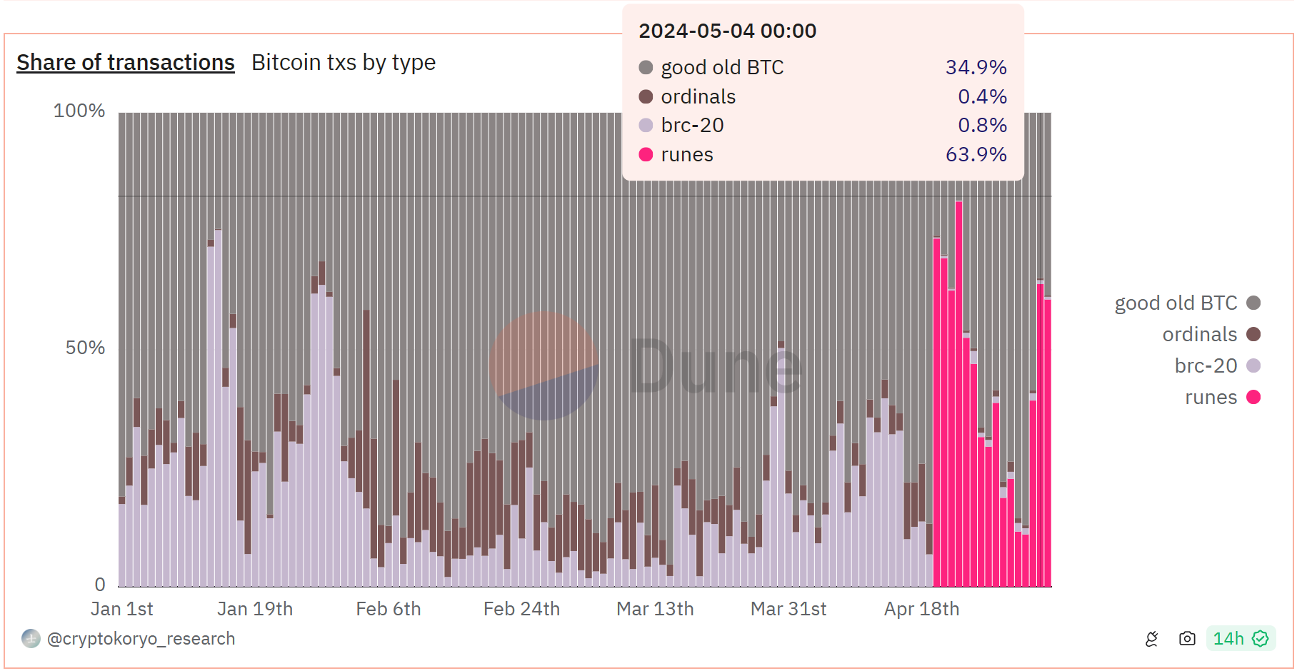 来自 Dune Analytics 的数据显示,截至 4 月 24 日,与 Runes 相关的交易占比特币网络交易的大部分。