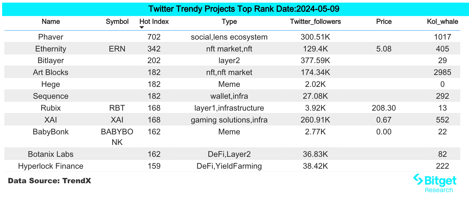 加密市场的 AI 赛道会持续跟随美国科技公司的相关新产品,新技术,新合作展开炒作。AI 赛道已经明显称为一个清晰的炒作赛道,投资者应该区分清楚该赛道下各细分领域龙头,在有相关题材可以被炒作时第一时间关注。但是此类炒作多半实质性合作机会较小,投资者也需要同时注意风险。