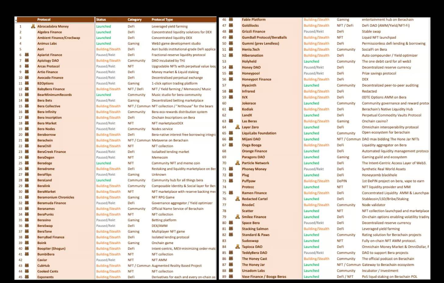 有一个由超过60个Berachain独家项目组成的丰富社区:从再质押协议、独立游戏、货币市场、NFT AMM、流动性聚合器、发射台等等。此外,还有许多由风投支持的Berachain原生项目,包括 Infrared Finance, Kodiak, Beraborrow, Gummi, Beratone 等。