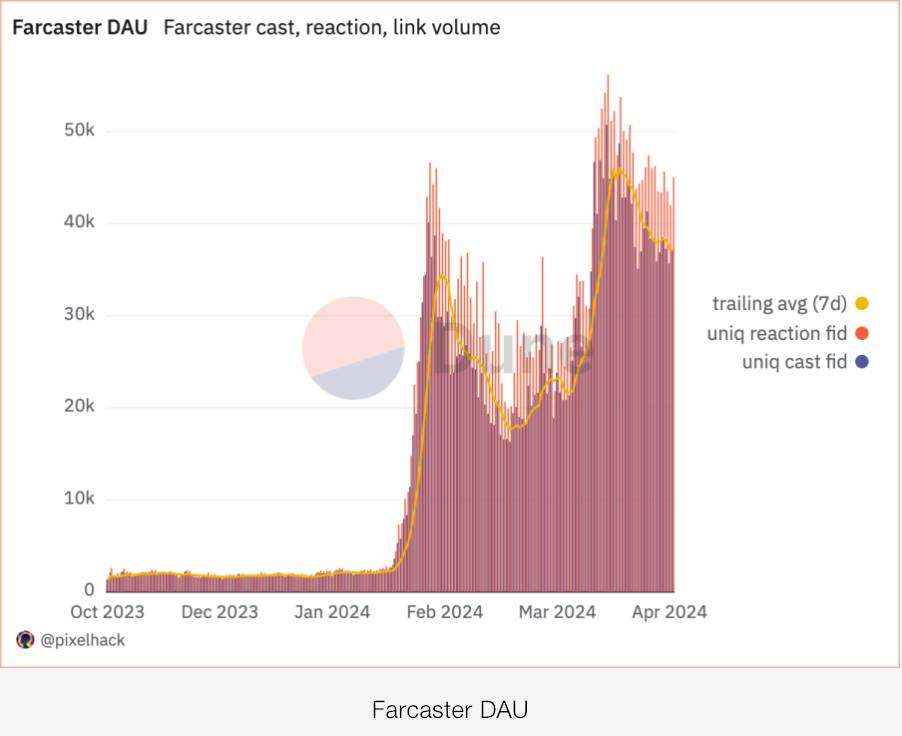 作为一个注册需要收费5美元的社交协议,Farcaster的门槛对于大多数普通用户有些高,但仍然取得了显著成绩,可以看到FarcasterDAU从1月份的不到500迅速增加到一度突破5万,而注册用户也从不足3万上升到30万。