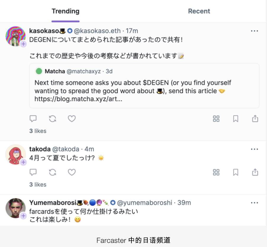 同样的剧本也发生在Farcaster,虽然Farcaster最主流的客户端Warpcast长期都没有任何英语之外的版本,但是仍然抵挡不住来自其他地区新用户的热情。例如大量来自日本的用户正聚集在/Japanese和几个本地的频道,日语区已经成为Farcaster最活跃的几个频道之一。