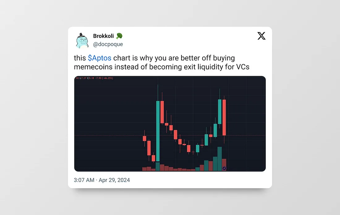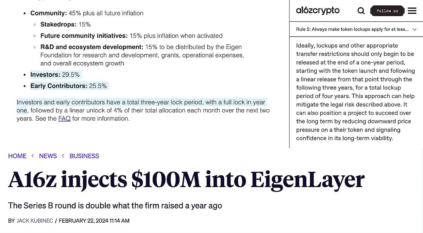 EigenLayer,可以说是这个周期中最大的以太坊协议,是一个经典的例子。内部人士(风投和团队)持有相当大的部分,达55%,而最初的社区空投仅为5%。这是一个典型的低流通量,高FDV的游戏,由拥有29.5%股份的风投支持。上一个周期,我们责怪FTX/Alameda,但这个周期我们也好不到哪儿去。