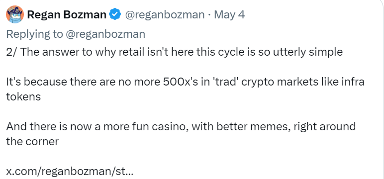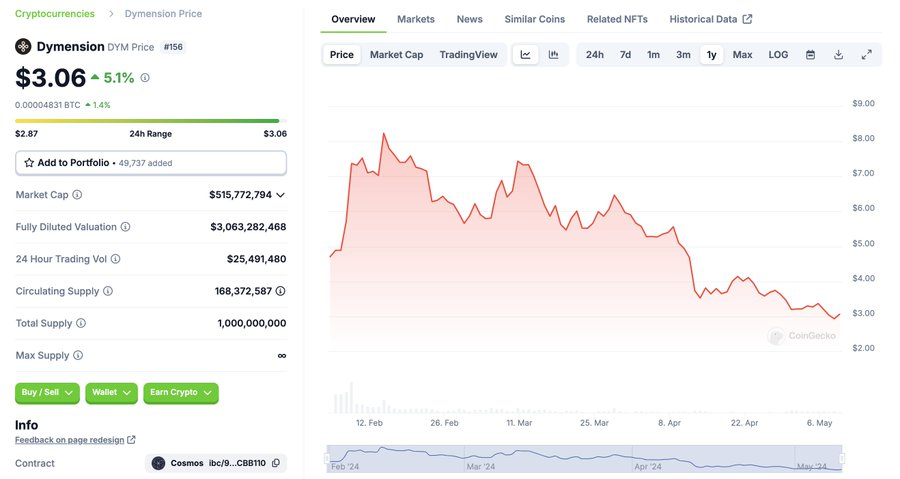 我们需要真正惊人的散户流动来抵消数十个超大规模的FDV(Fully Diluted Valuation)发行。但现在散户投资者都在从“Eigen爸爸”那里领取免费资金,因此没有买家。像$DYM 这样的“只跌不涨”的图表到处都是。