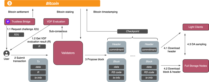轻客户机承担 DAS 过程以验证数据可用性。此外,在提出阈值数量的区块后,该历史的检查点通过比特币时间戳记录在比特币区块链上。这确保 validator 集可以阻止潜在的远程攻击并支持快速解除绑定。