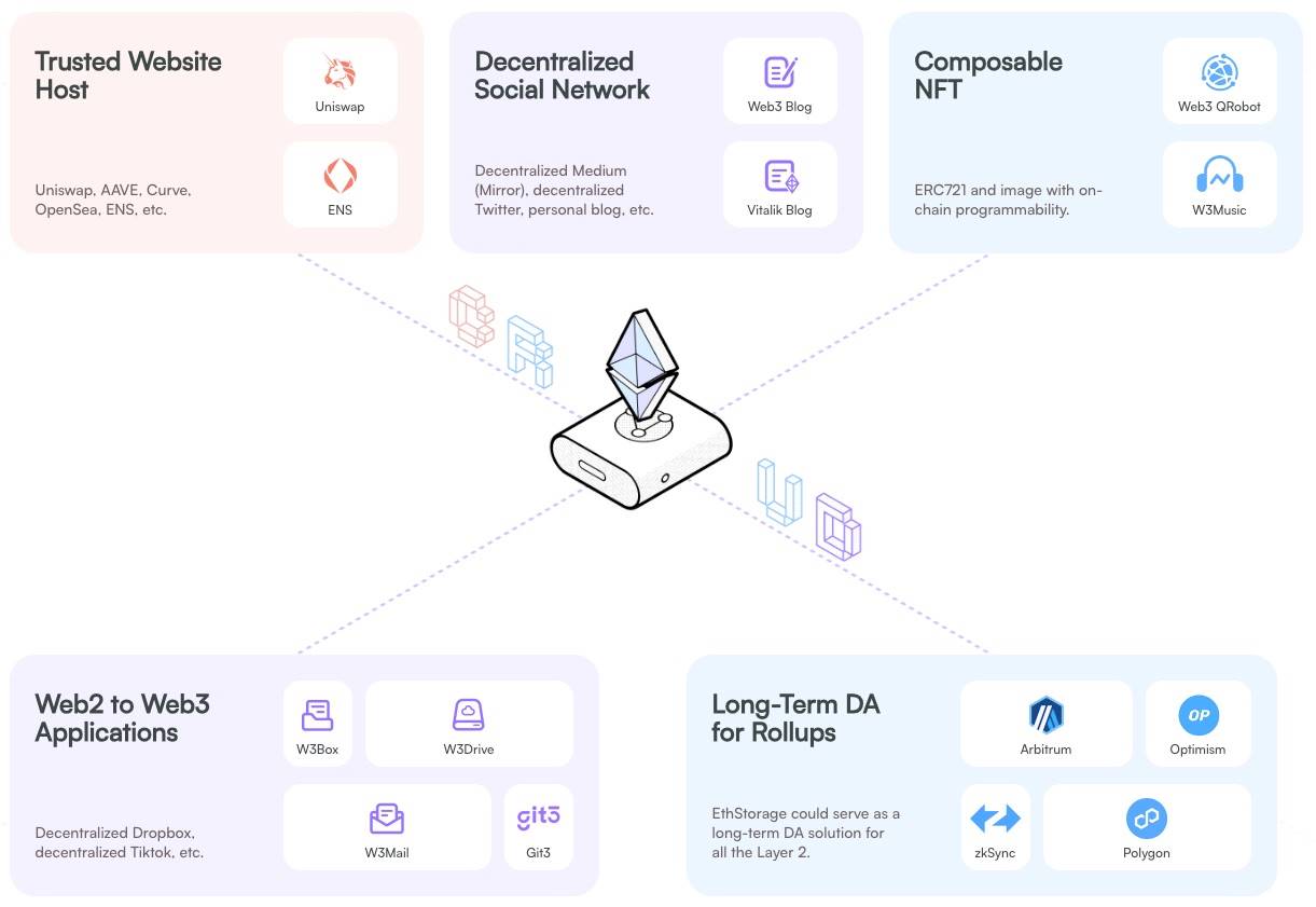 EthStorage是第一个实现动态的去中心化存储的模块化 Layer2,提供由 DA 驱动的可编程键值(KV)存储,以 1/100 到 1/1000 的成本将可编程存储扩展到数百 TB 甚至 PB。它为 Rollups 提供了长期的 DA 解决方案,并为游戏、社交网络、AI 等完全链上的应用程序开辟了新的可能性。