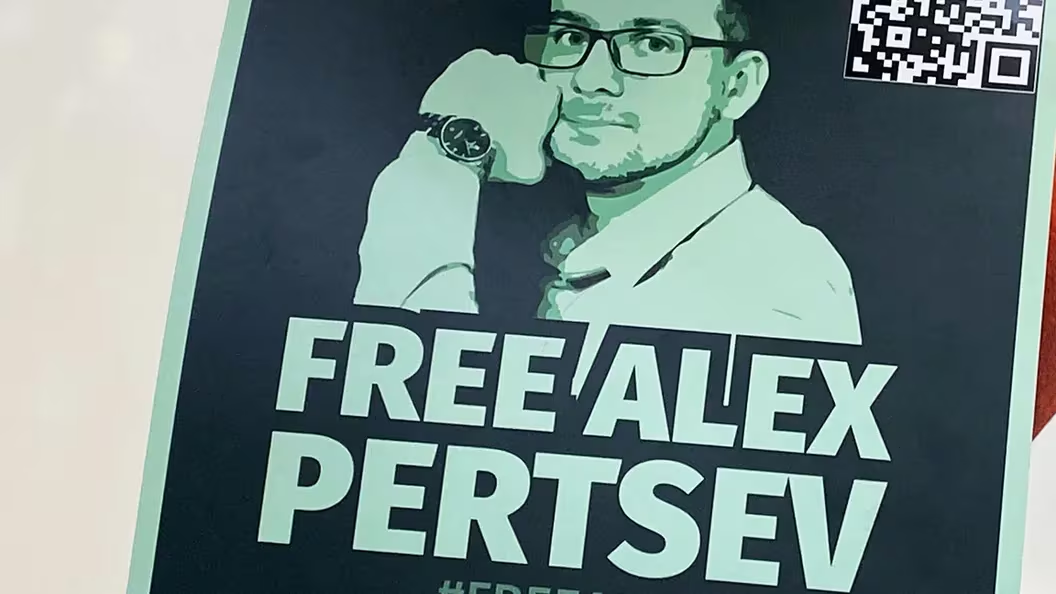 此前荷兰法院外有人发放支持 Alexey Pertsev 的海报
